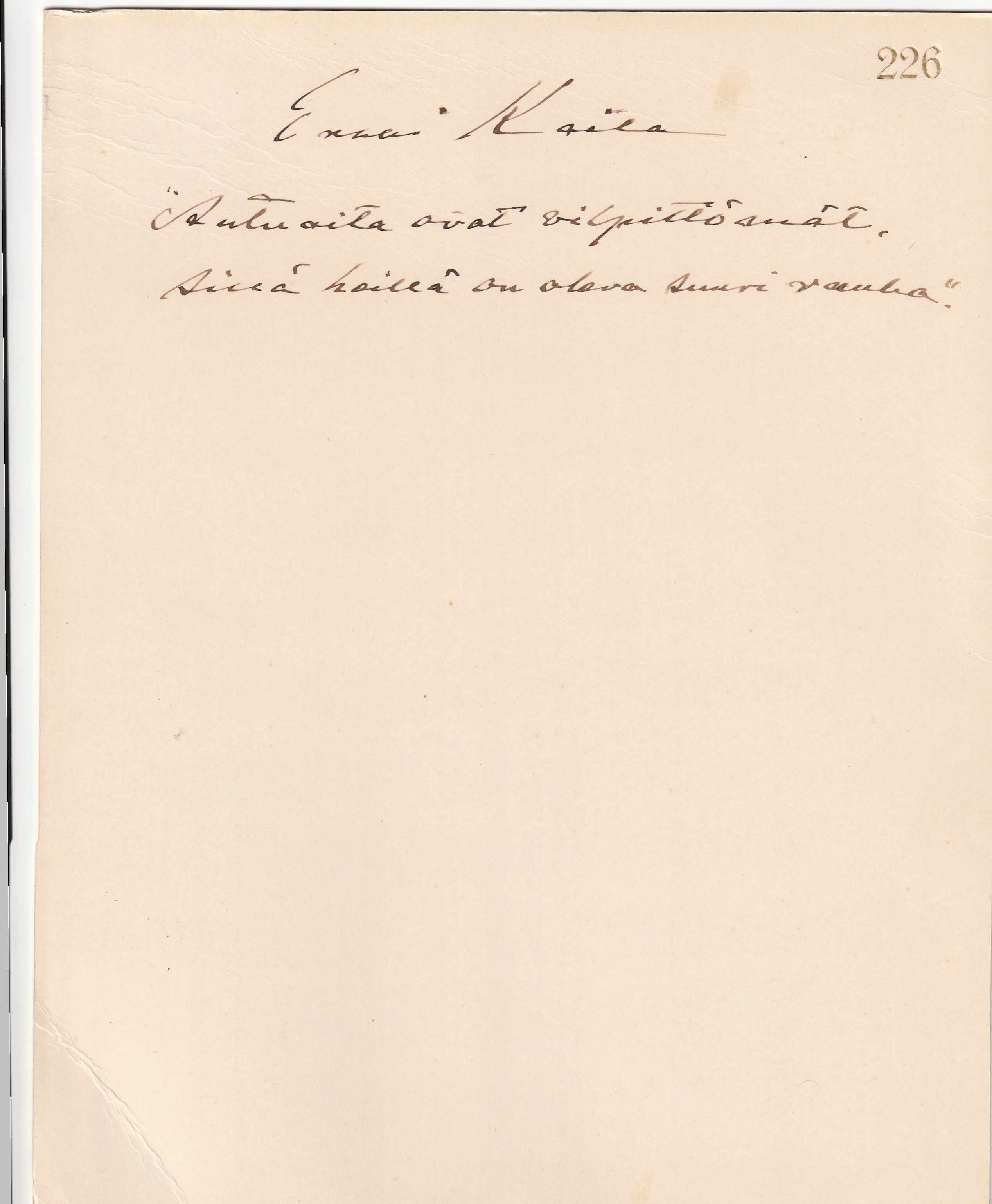 20 x 26,5 cm kokoinen kartonki, jolla Kailan kirjoitusta: ”Autuaita ovat vilpittömät, sillä heillä on oleva suuri rauha.”