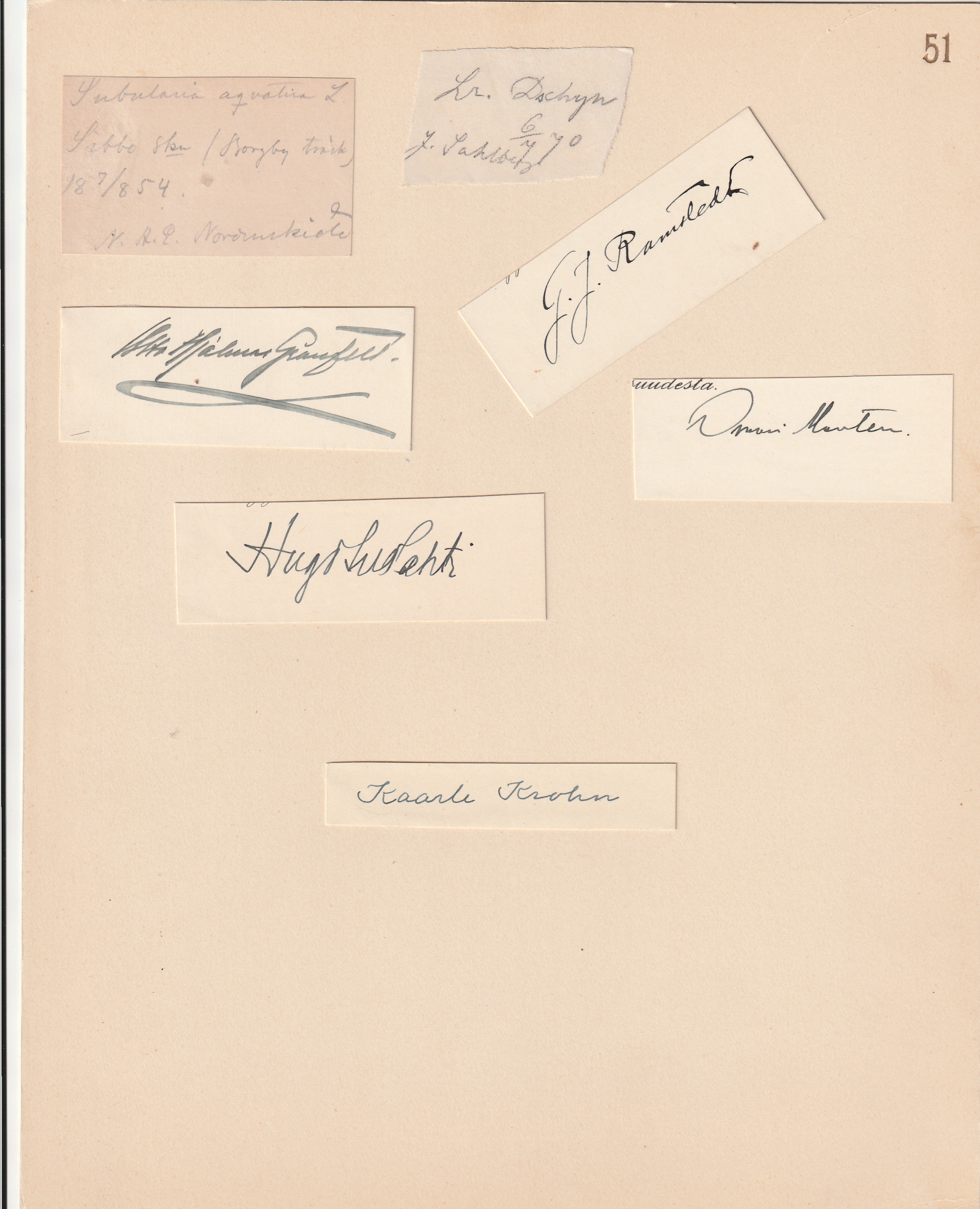 20 x 26,5 cm kokoinen kartonki, johon liimattuina papereita, joilla Nordenskiöldin kirjoitusta ”Subularia aquatica, Sibbo sku / Borgby träsk 18 7/8 54. N A. E. Nordenskiöld” sekä mm. tieteilijät/tutkijat John Sahlberg (1845-1920), G. J. Ramstedt (1873-1950), Kaarle Krohn (1863-1933) sekä Hugo Suolahti (1874-1944), oikeusministeri Otto Hjalmar Granfelt (1874-1957) ja pääministeri Oskari Mantere (1874-1942).