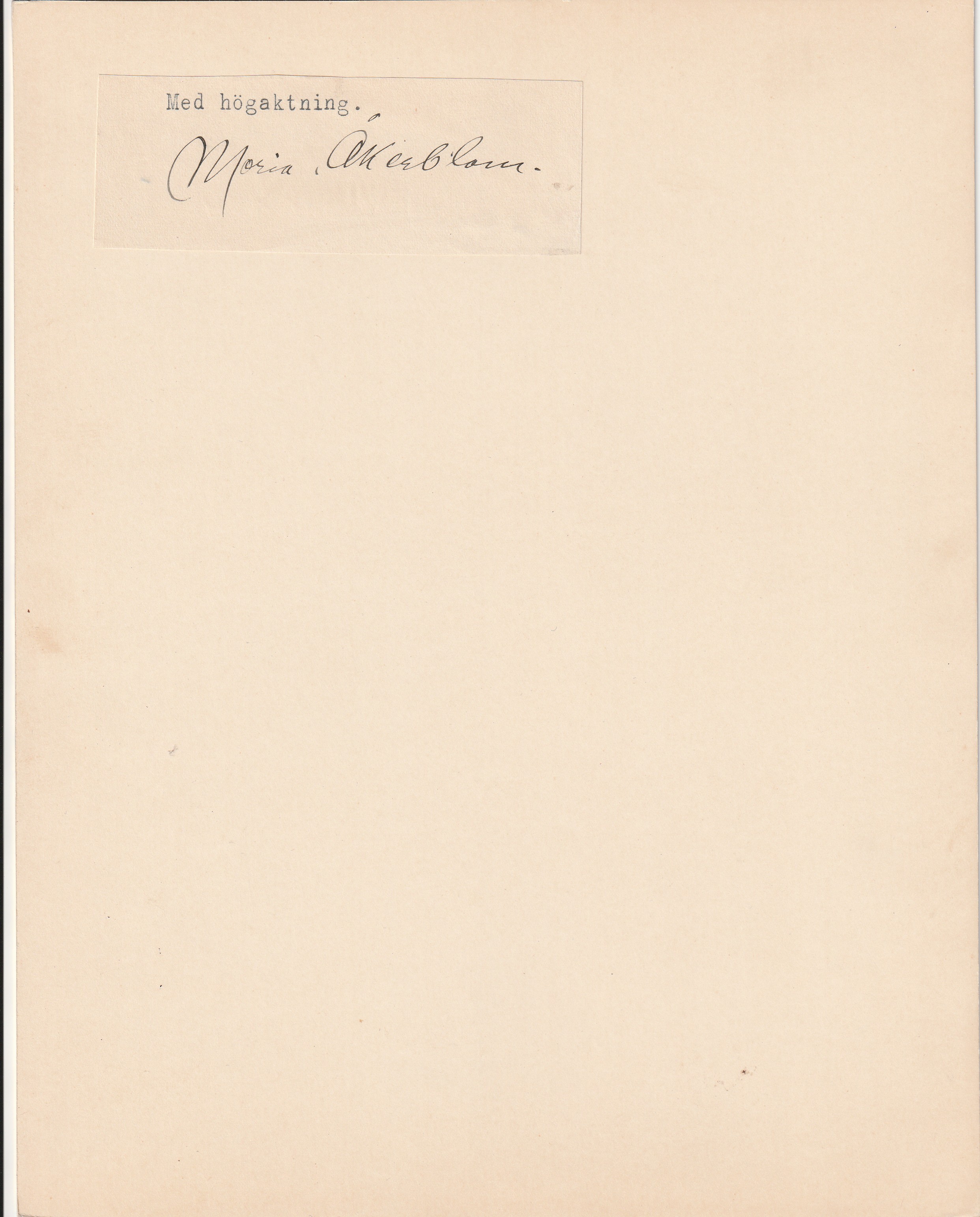 20 x 26,5 cm kokoinen kartonki, johon liimattuna paperi, jolla Åkerblomin nimikirjoitus.