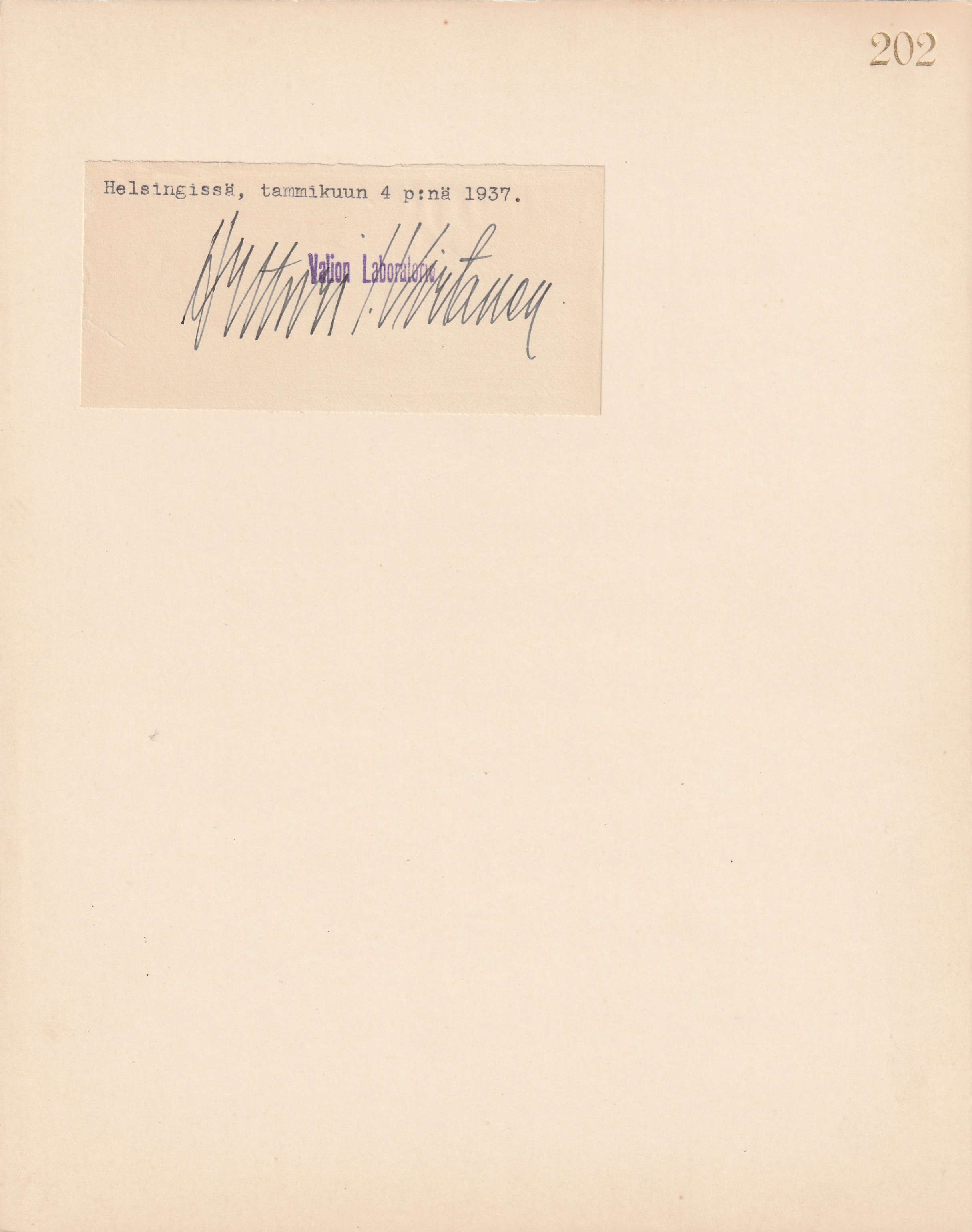 20 x 26,5 cm kokoinen kartonki, johon liimattuna paperi, jolla Virtasen nimikirjoitus.