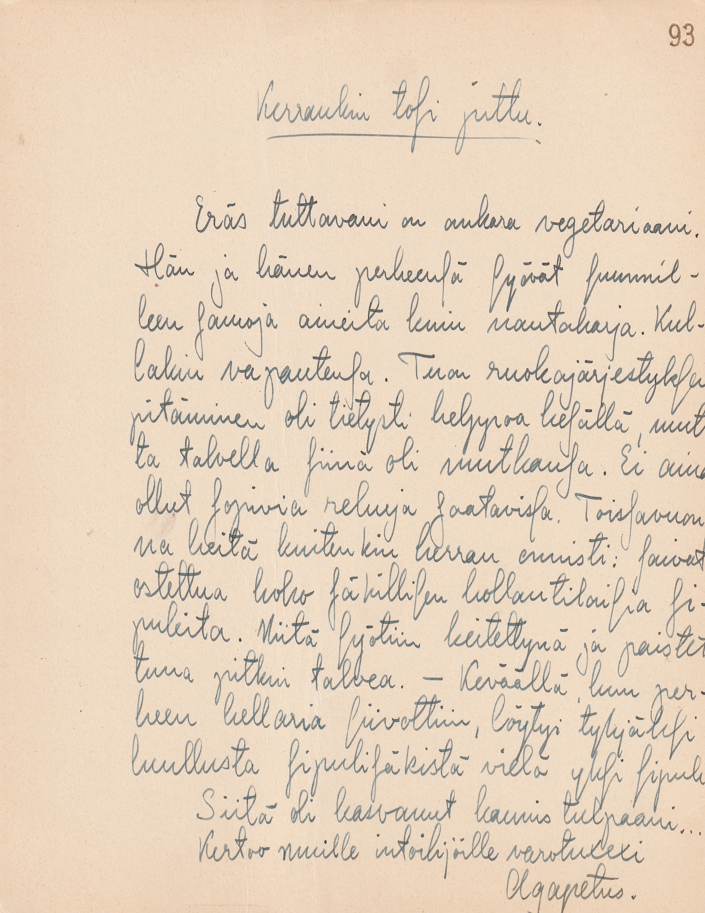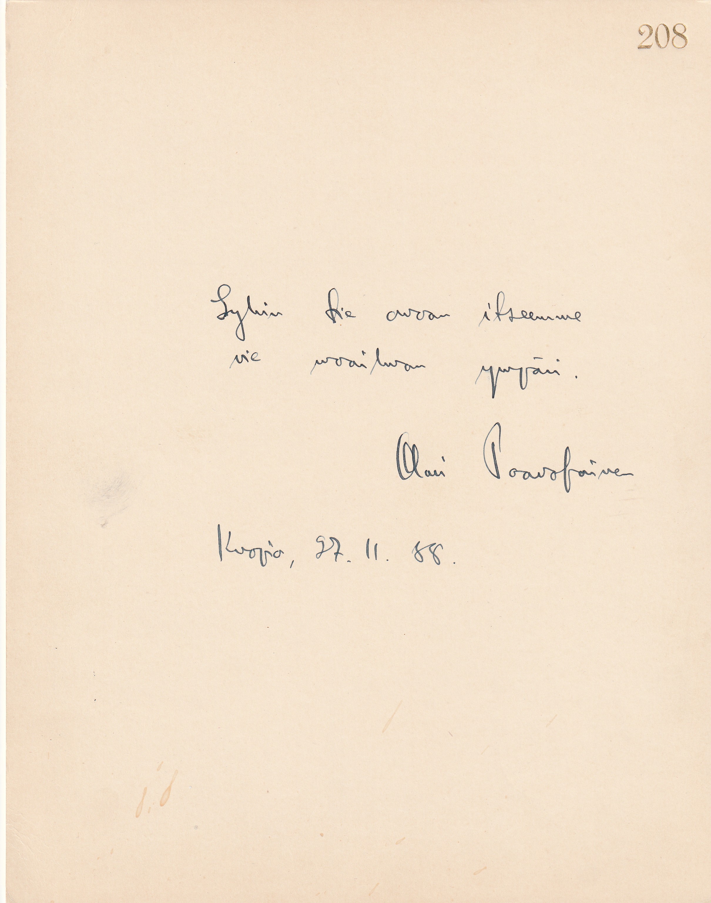 x 26,5 cm kokoinen kartonki, jolla Agapetuksen/Soinin omakätinen