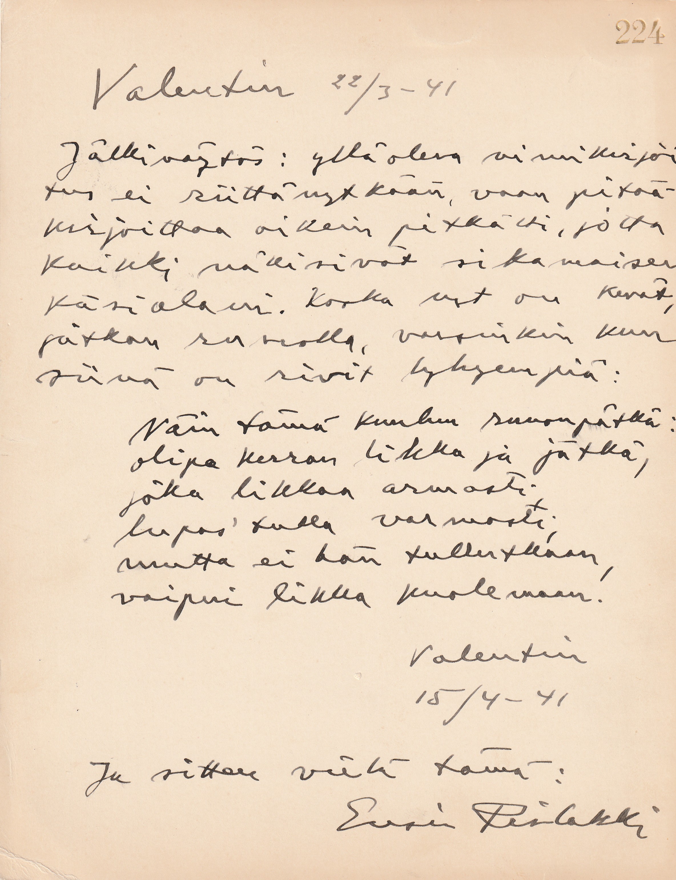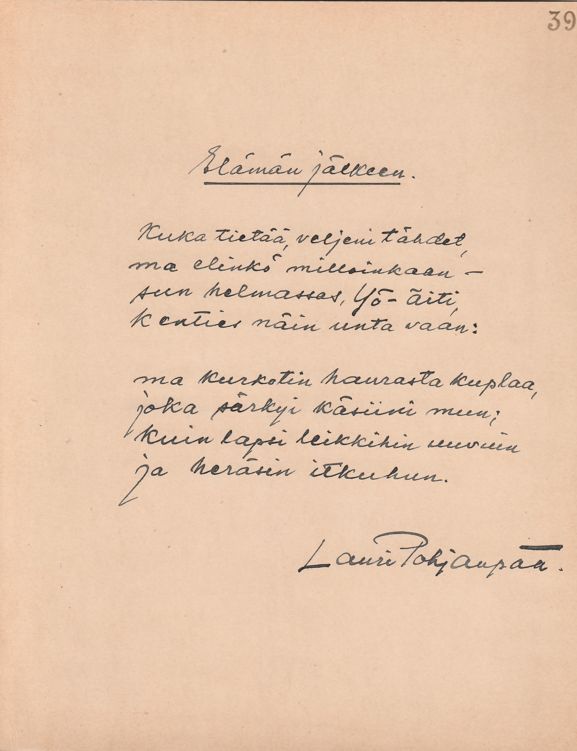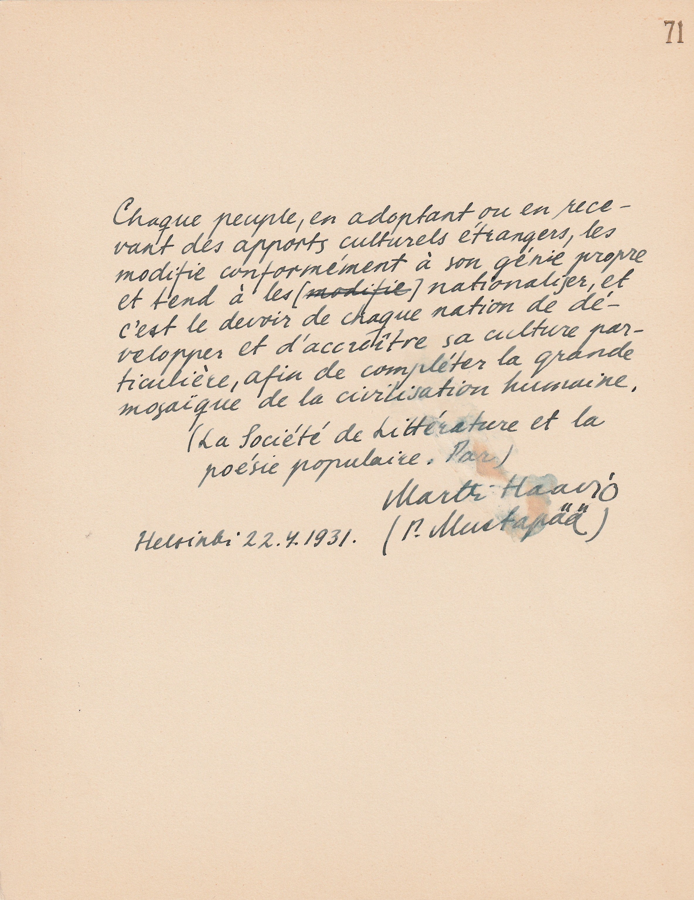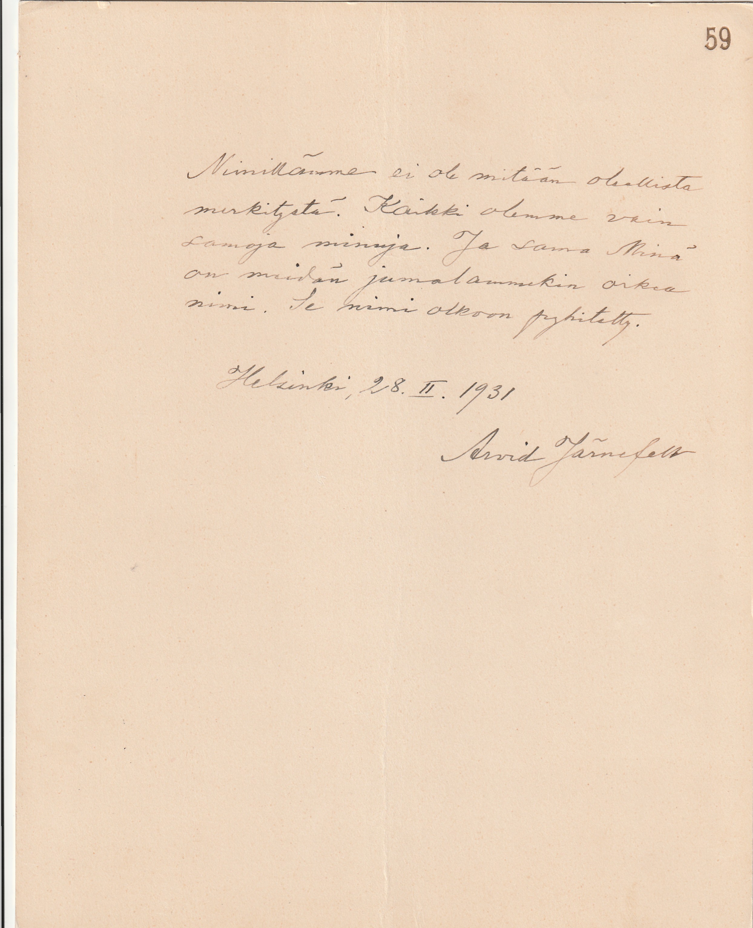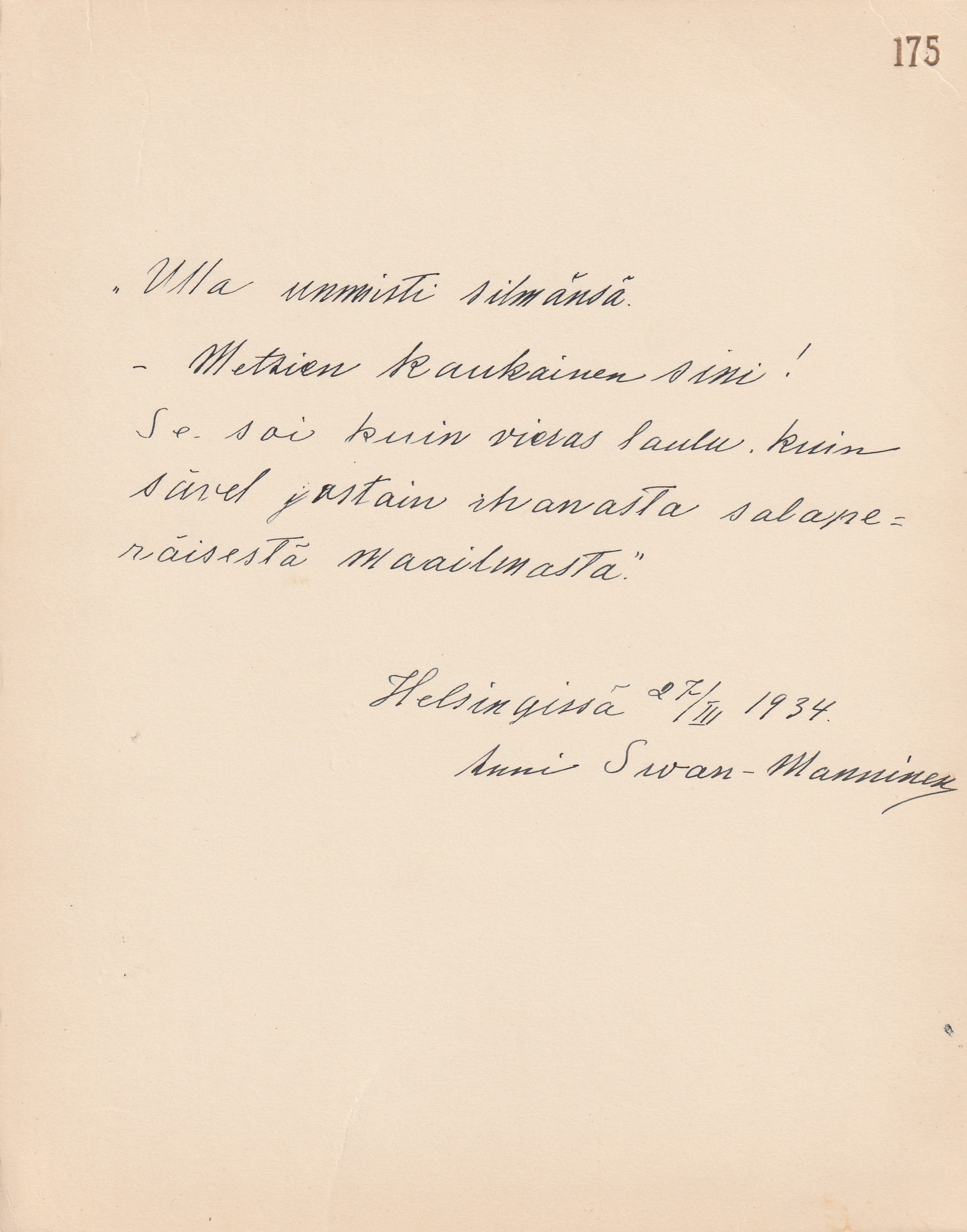 ihanasta salaperäisestä maailmasta”. Päivättynä Helsingissä 27/III
