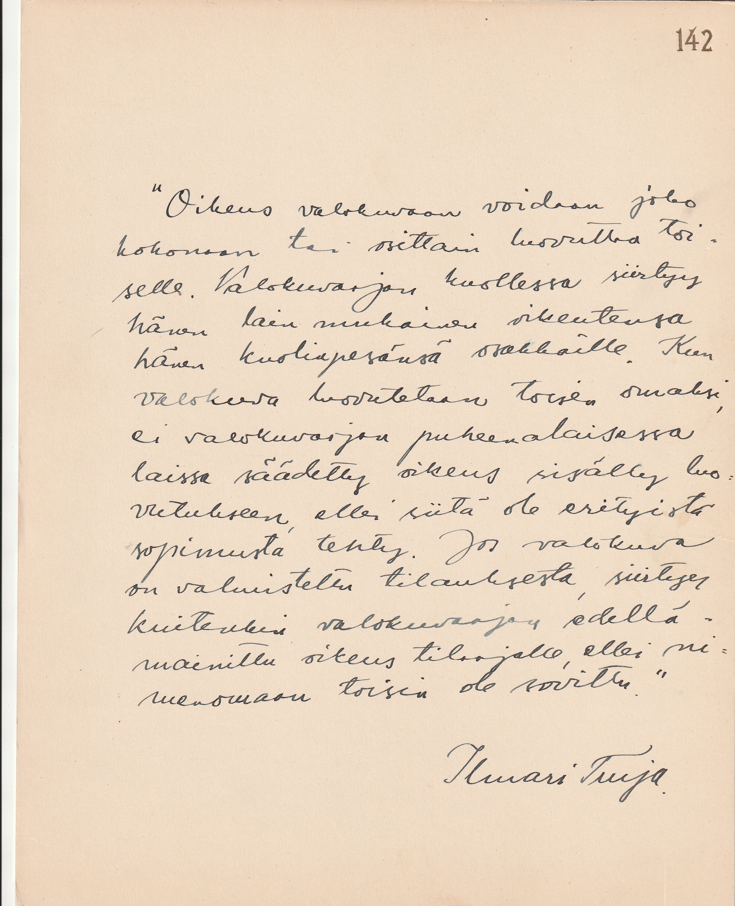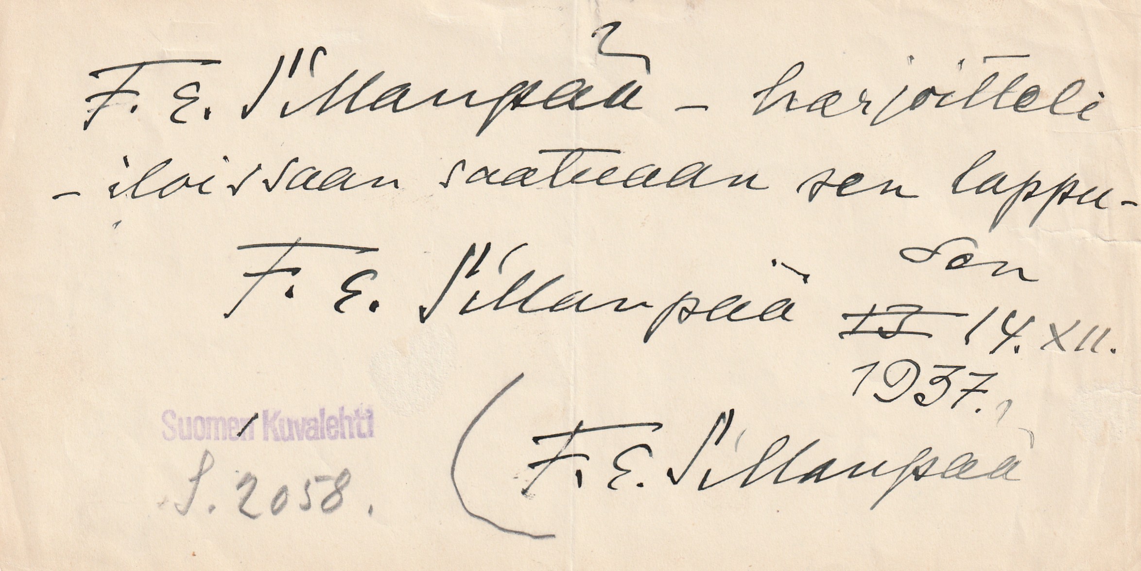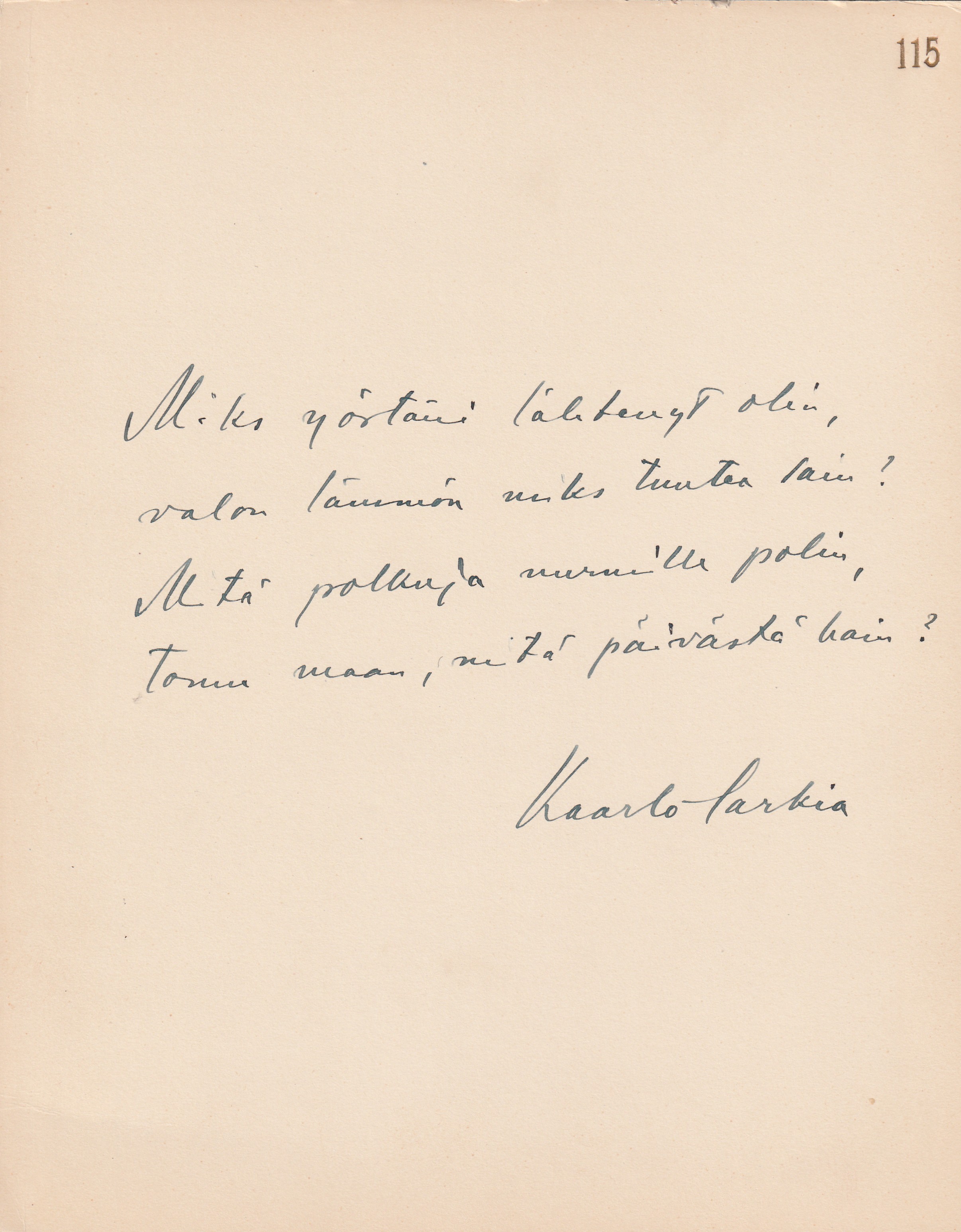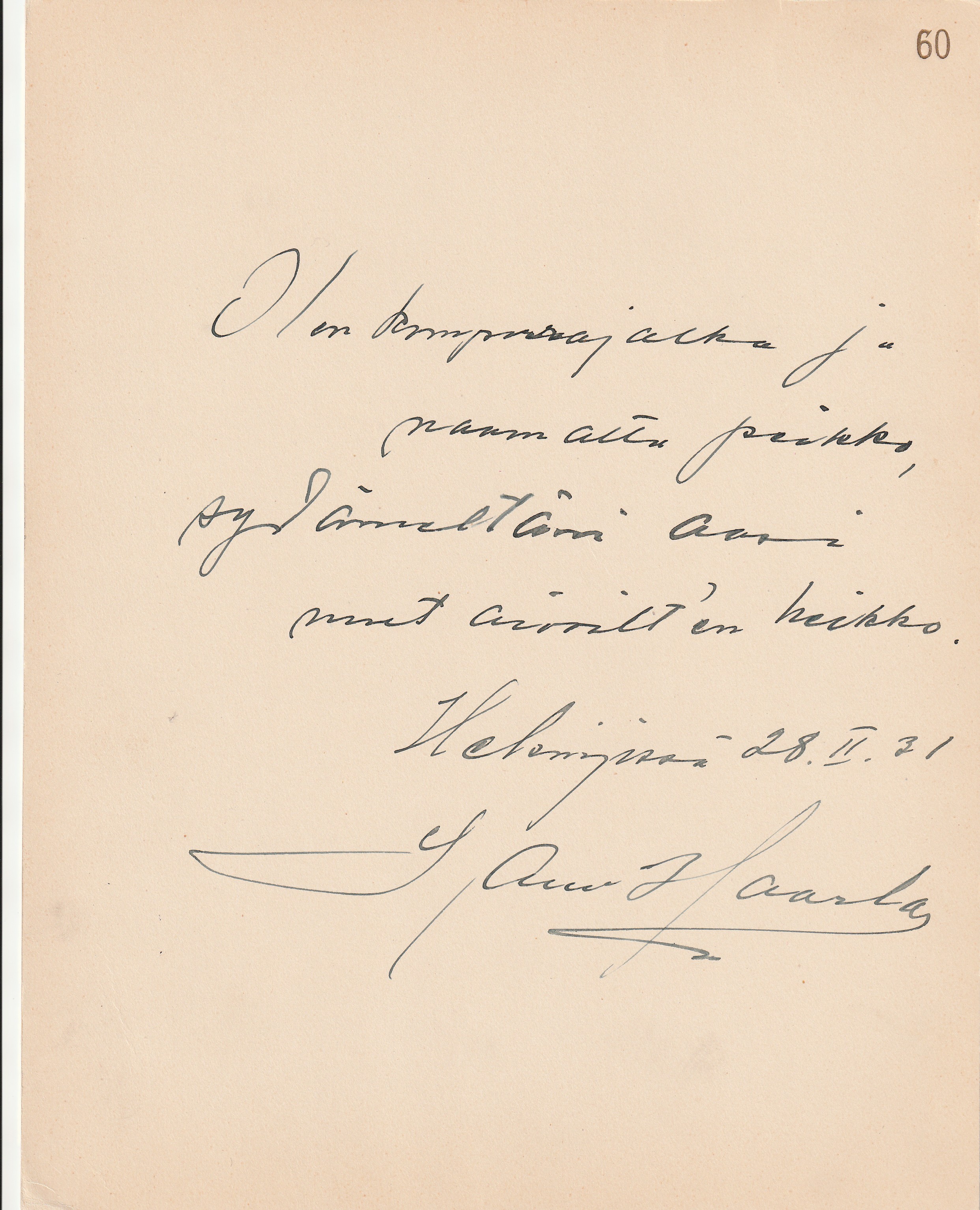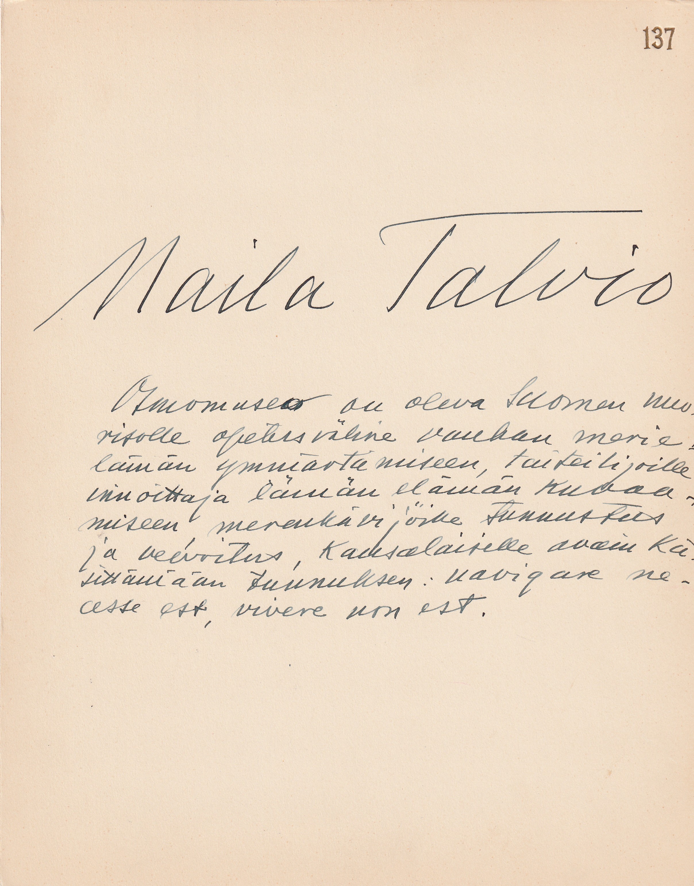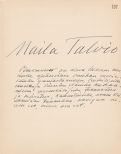 kartonki, jolla Talvion omakätinen kirjoitus.