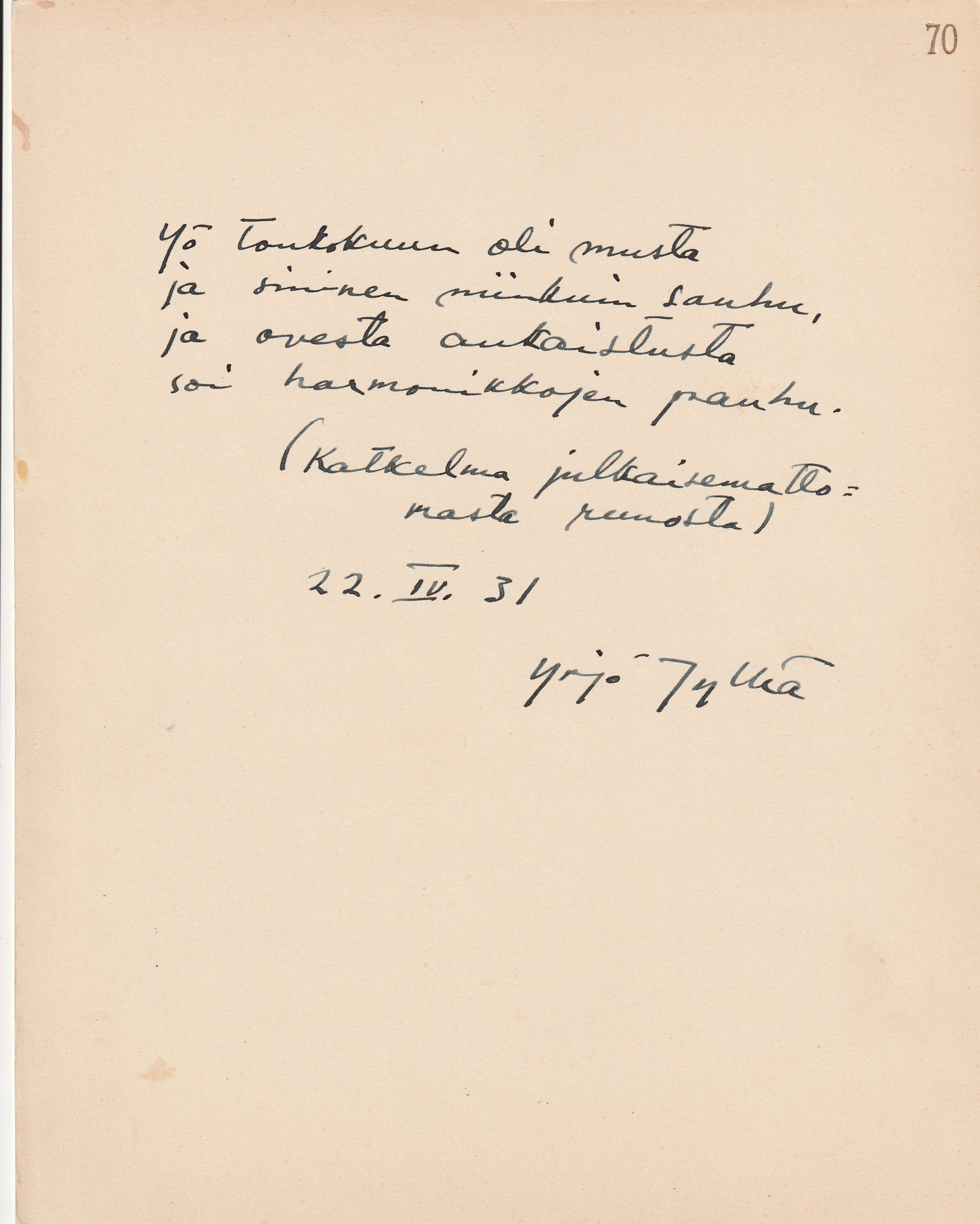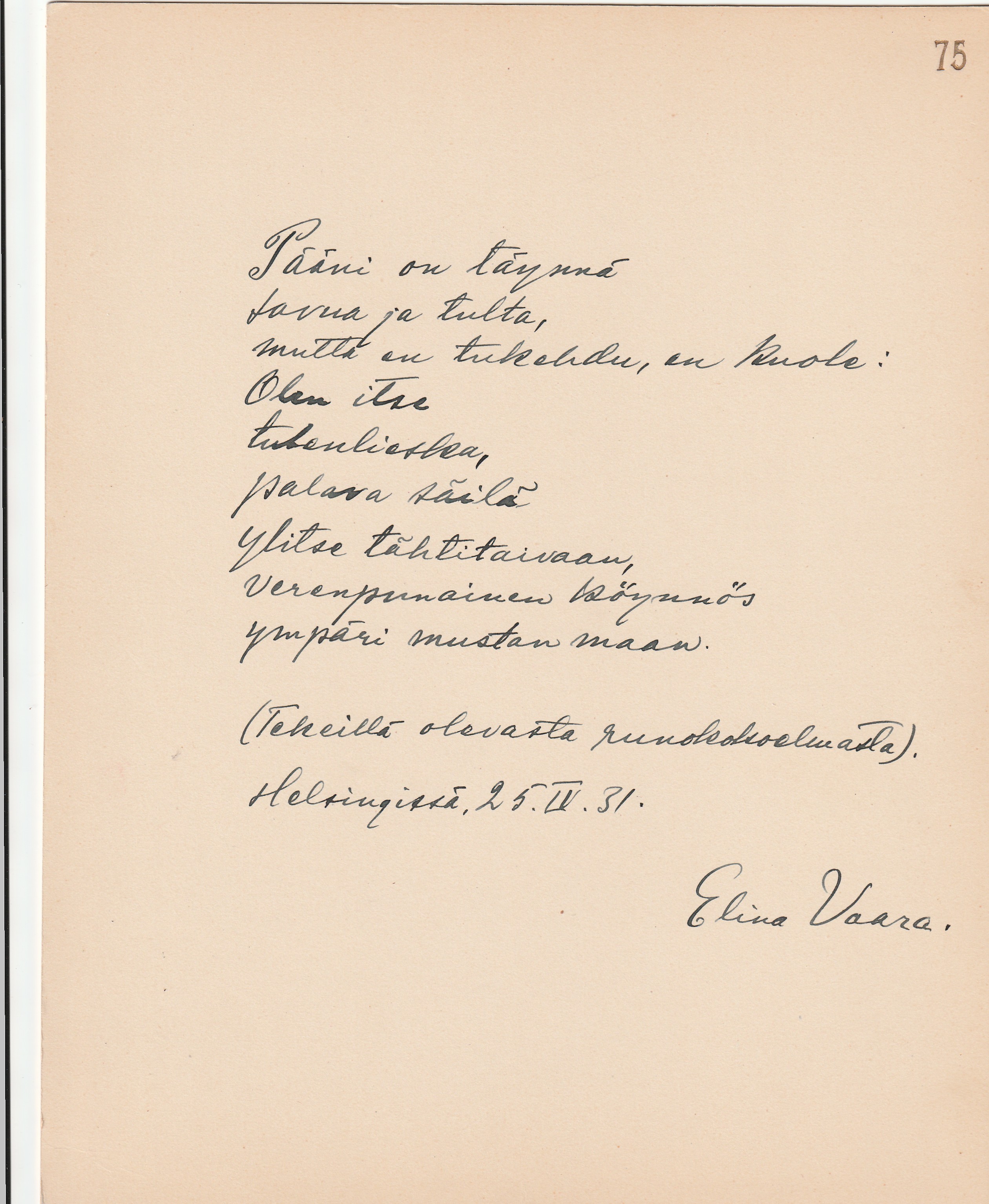 olevasta runokokoelmasta” päivättynä ”Helsingissä 25.IV.31”.