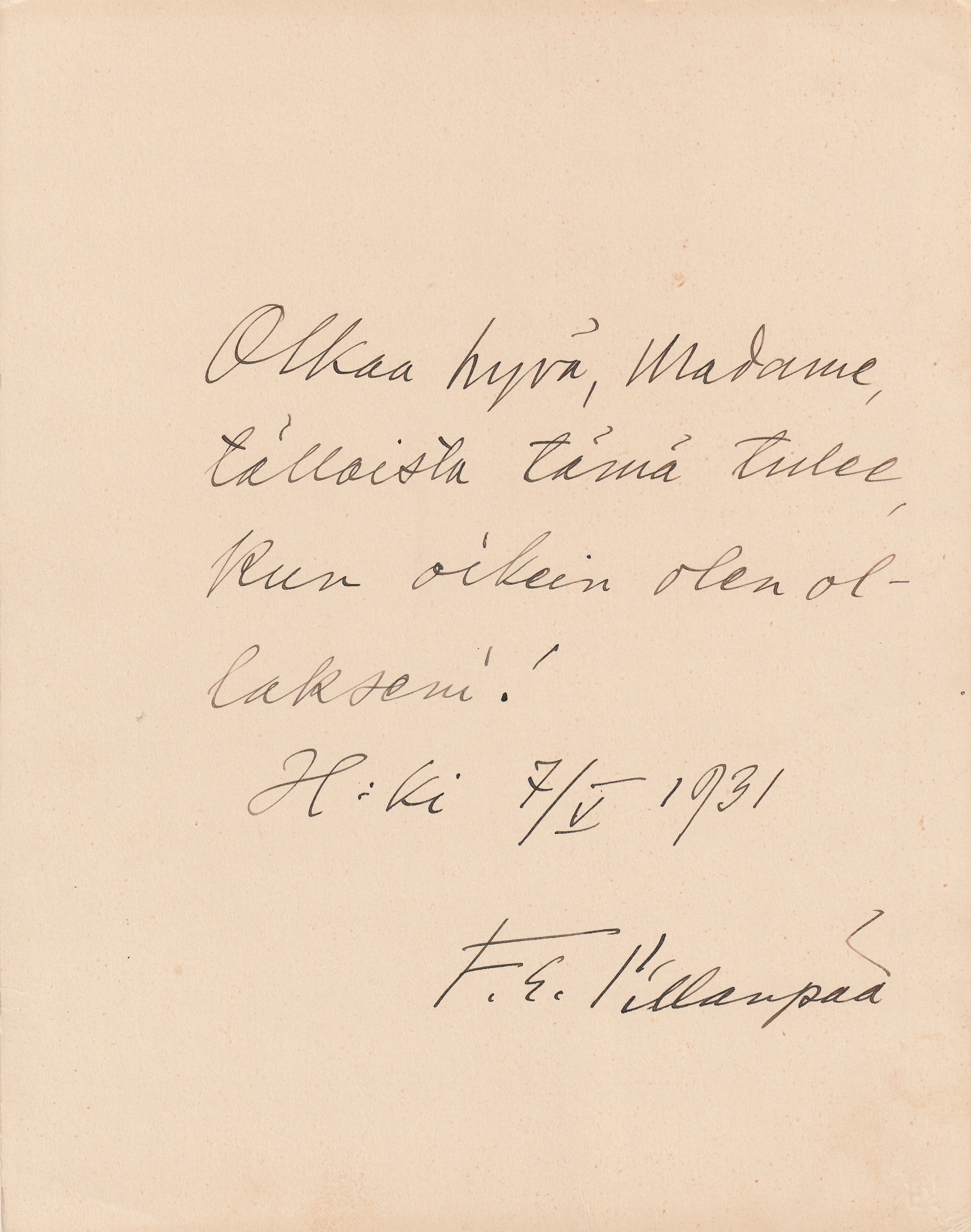 x 11 cm kokoinen paperilappu, jossa Hämäläisen tervehdys: ”Tyyne