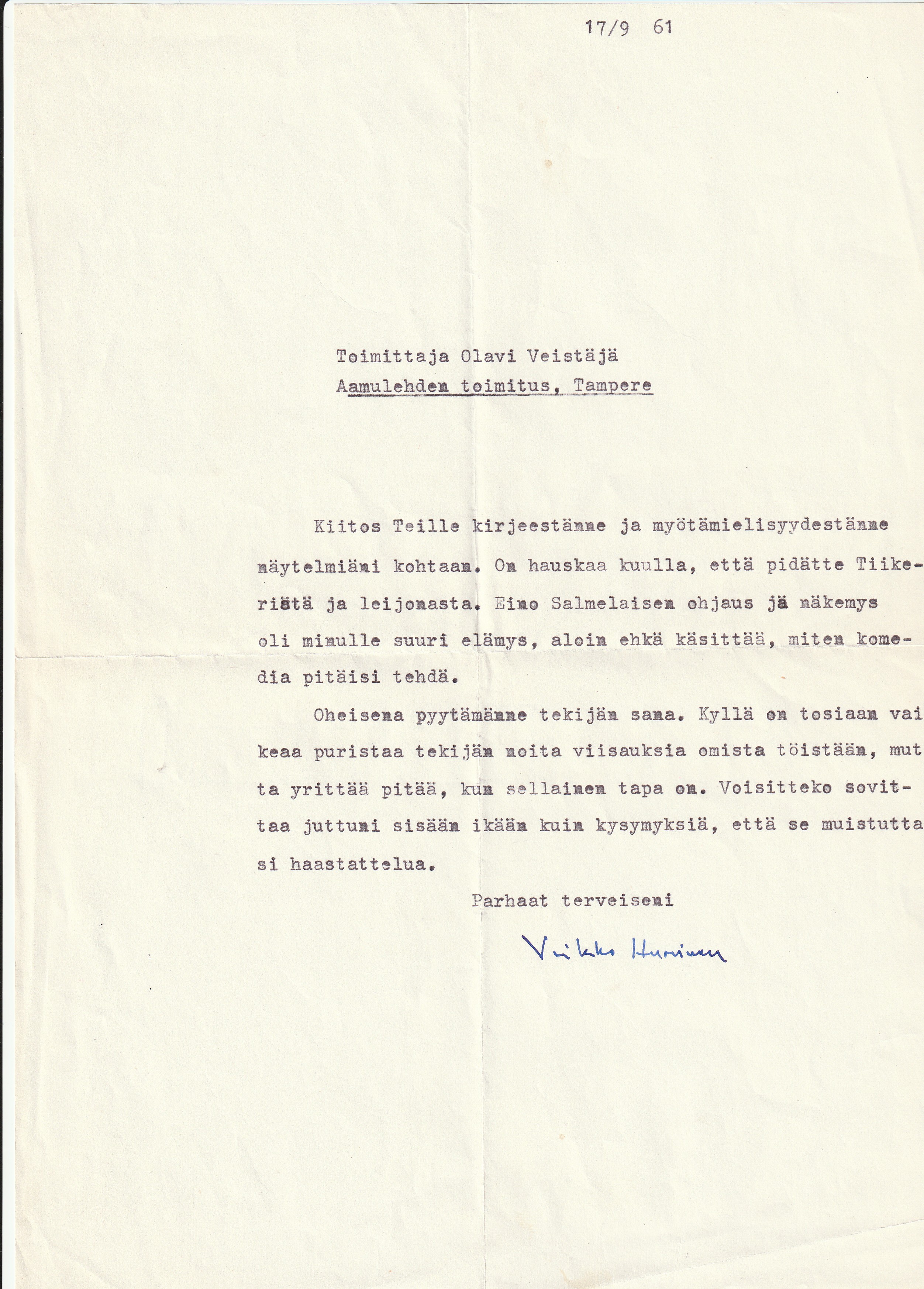A4-kokoinen koneella kirjoitettu kirje Aamulehden toimitukselle 17.9.1961, jossa Huovinen antaa tekstin haastattelua varten.