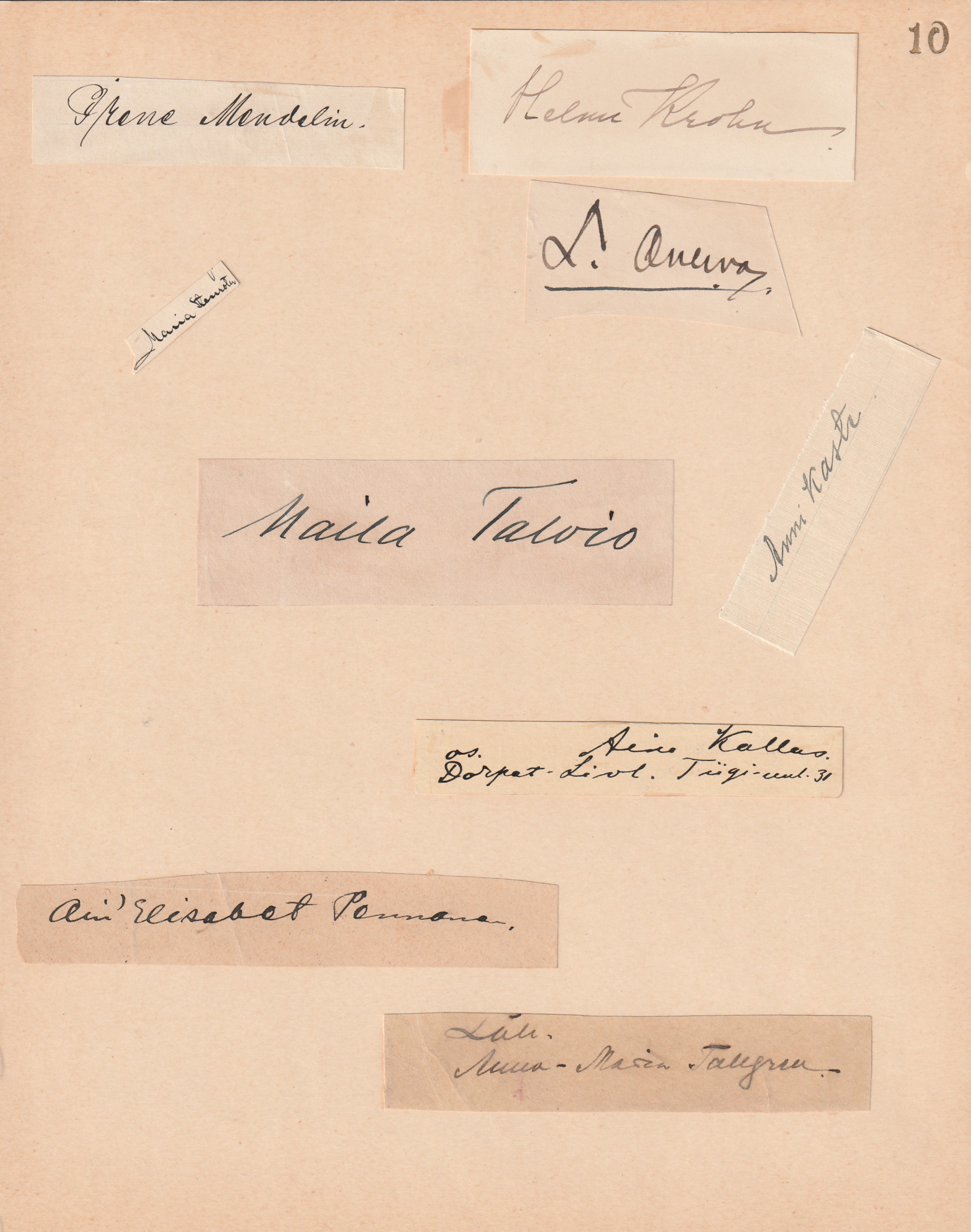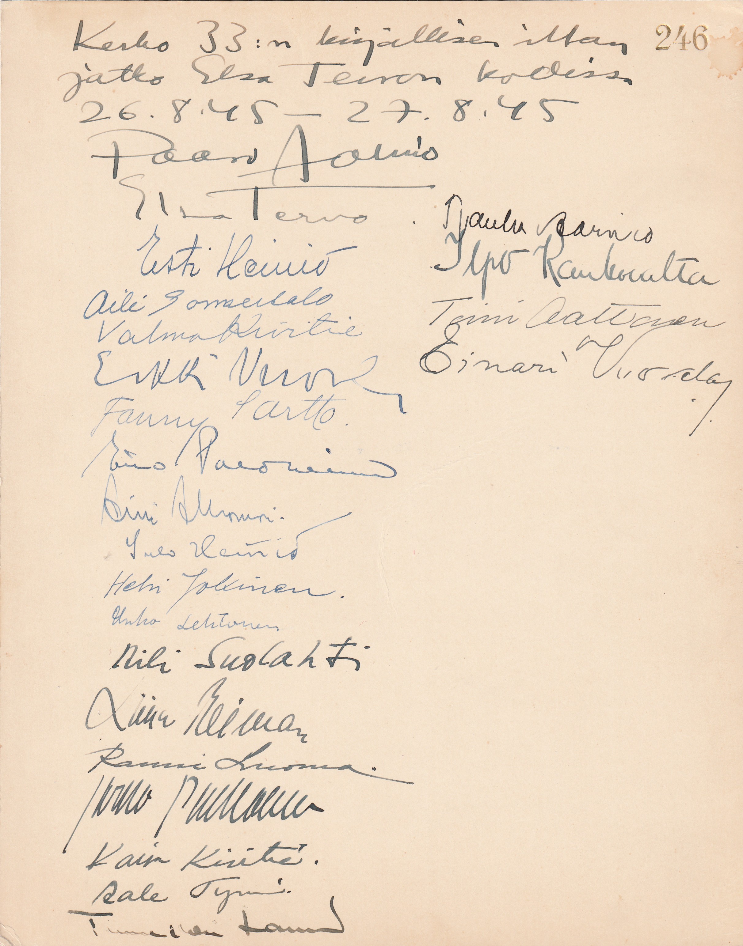20 x 26,5 cm kokoinen kartonki, jolla Tynnin lisäksi lukuisten muiden kirjailijoiden/taiteilijoiden nimikirjoitukset ”Kerho 33:n kirjallisen illan jatko Elsa Tervon kodissa 26.8.45-27.8.45. Paavo Aarnio” (1908-1989), Elsa Tervo (1892-1966), Esti Heiniö (1897-1978), Aili Somersalo (1887-1957), Valma Kivitie (1894-1967), Fanny Sartto (1877-1962), Eino Paloheimo (1901-1977), Sulo Heiniö (1888-1956), Helvi Jokinen (1910-1994), Urho Lehtonen, Aili Suolahti (1917-2012), Rauni Luoma (1911-1996), Kaisa Kivitie (1920-1978), Rauha Aarnio, Ilpo Kaukovalta (1913-1982) ja Einari Vuorela (1889-1972).