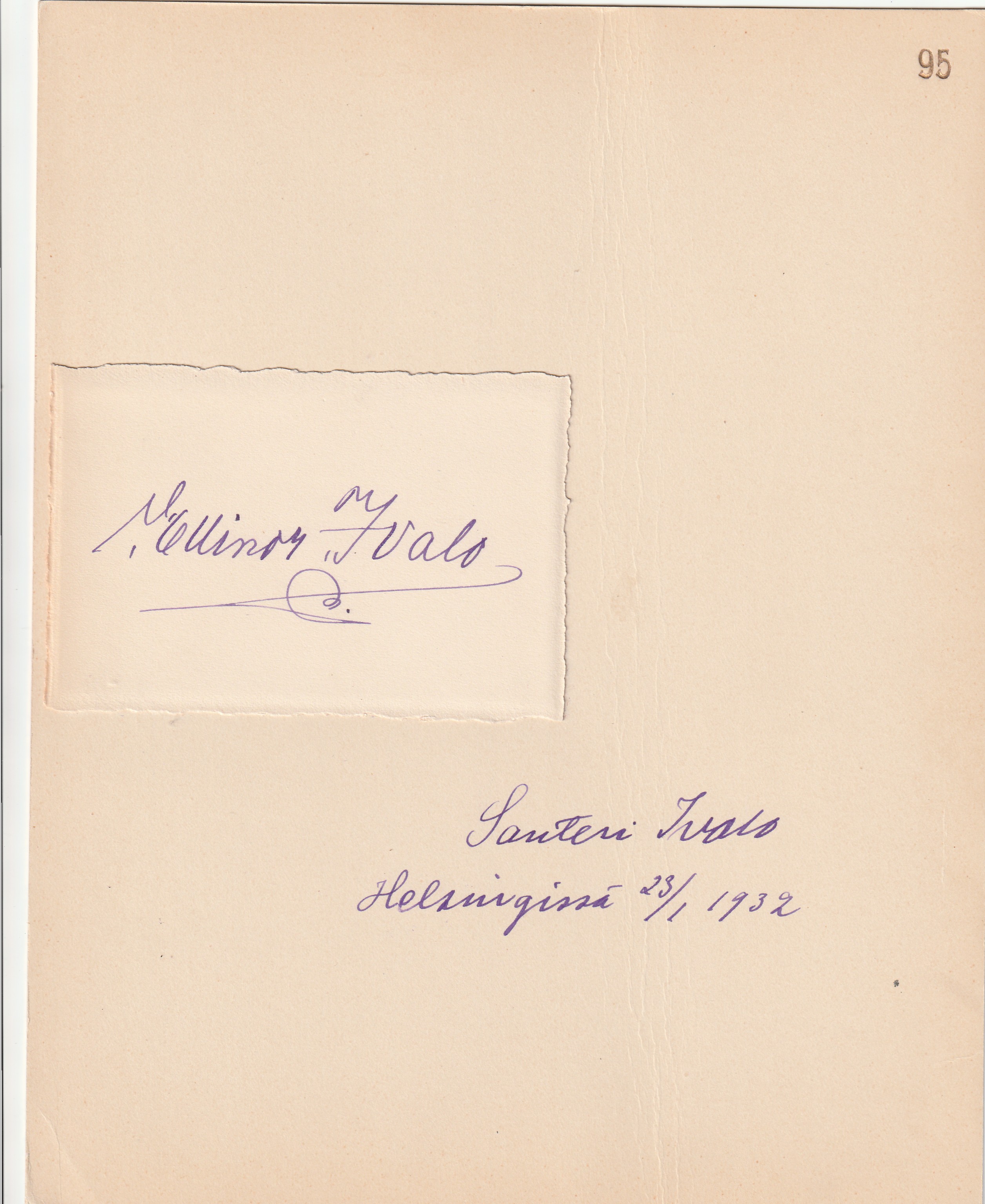 kartonki, johon liimattuna paperi, jolla Talvion nimikirjoitus sekä