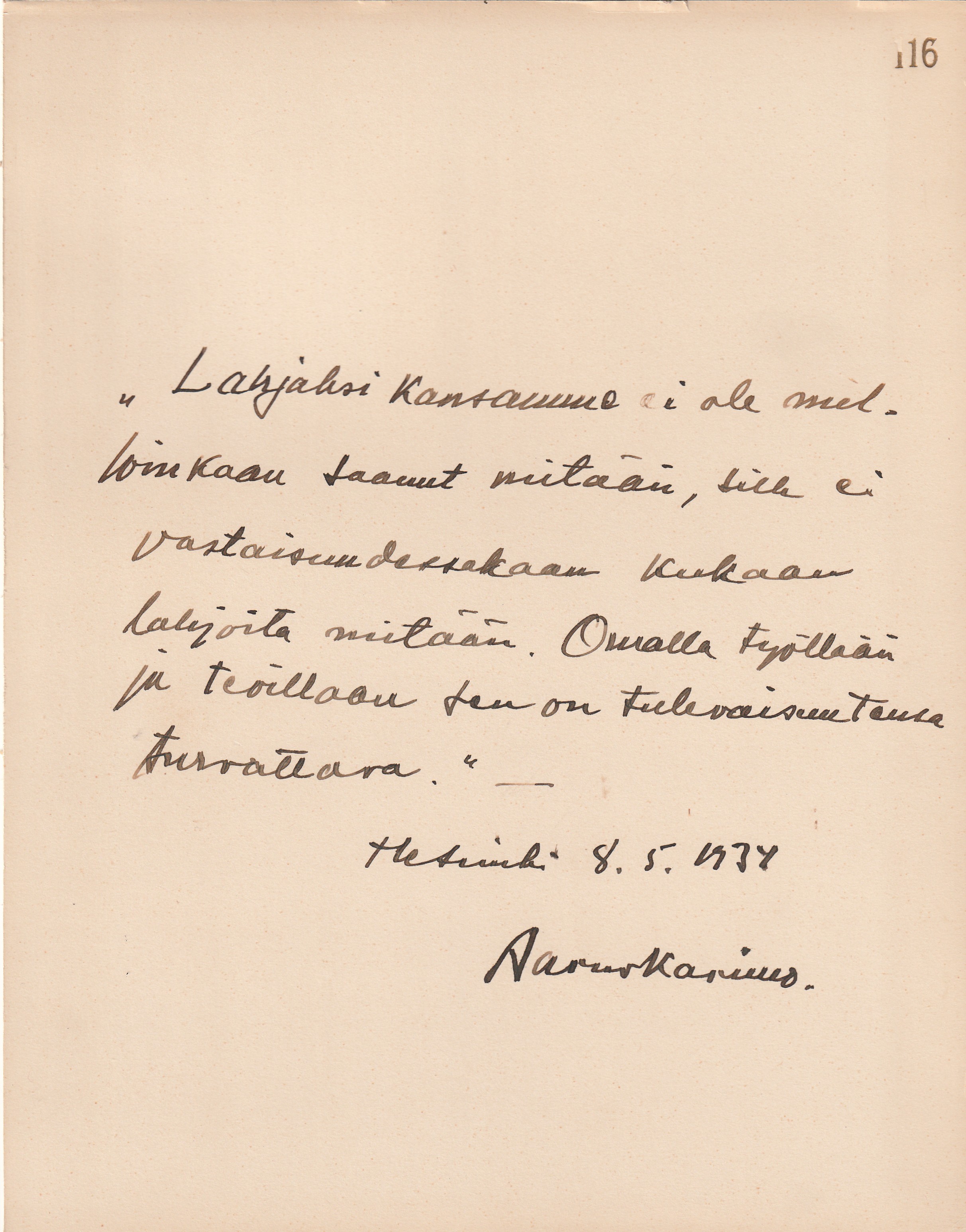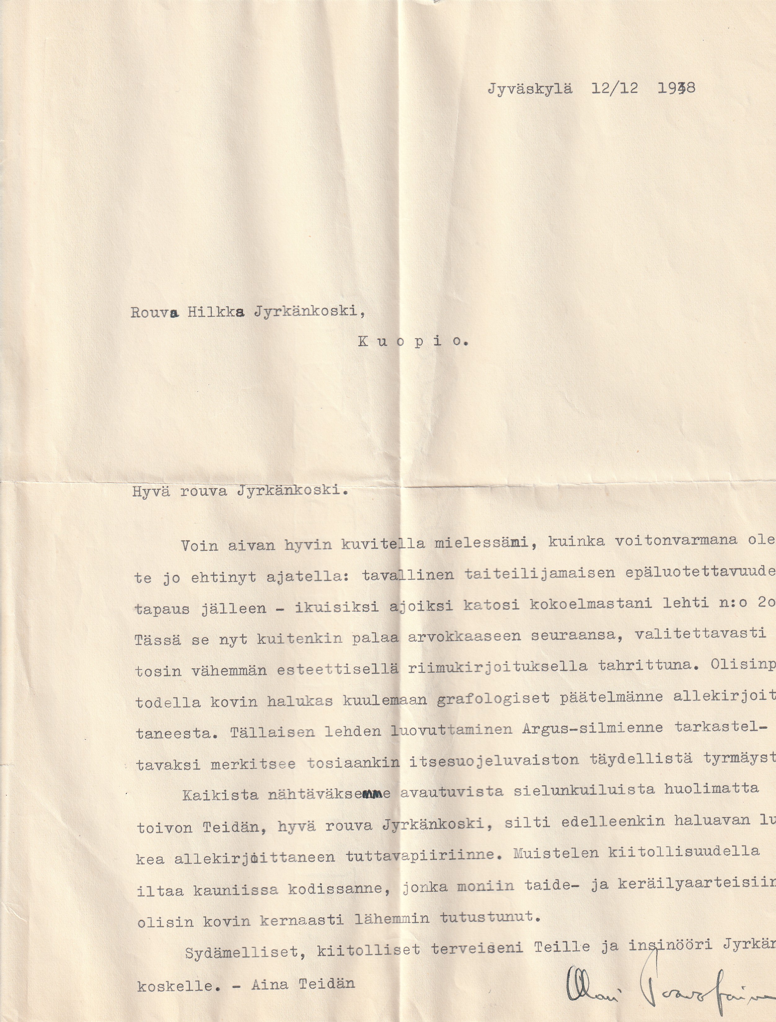 käsinkirjoittama tervehdys näyttelijä Aino-Maija Tikkaselle