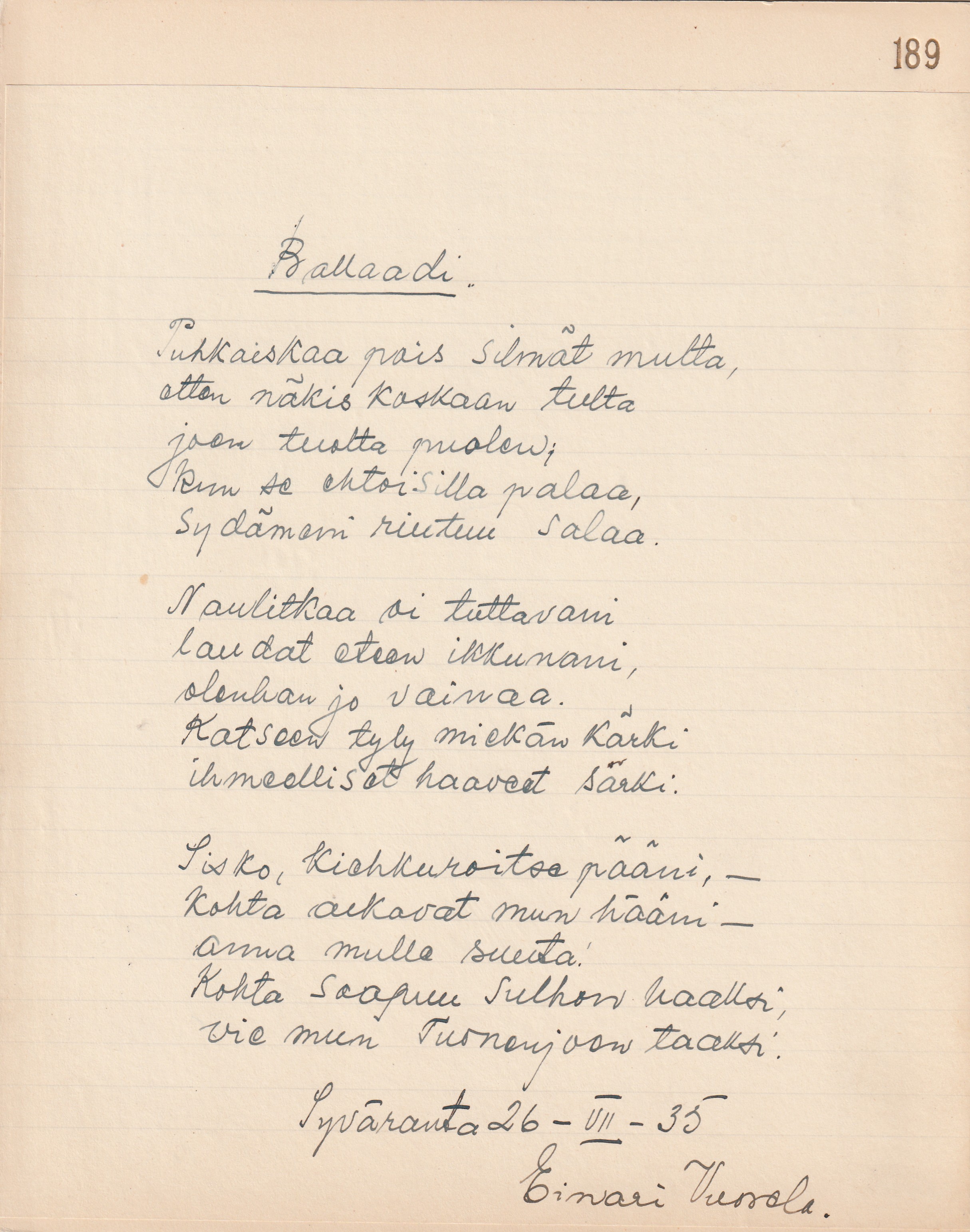 ”Balladi” päivättynä ”Pyhäranta 26-VII-35”.