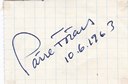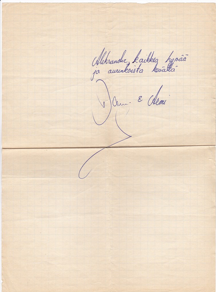 8 x 10,5 cm kokoinen paperilappu, jossa Laila Kinnusen tervehdys: "Lasselle Laila Kinnunen".