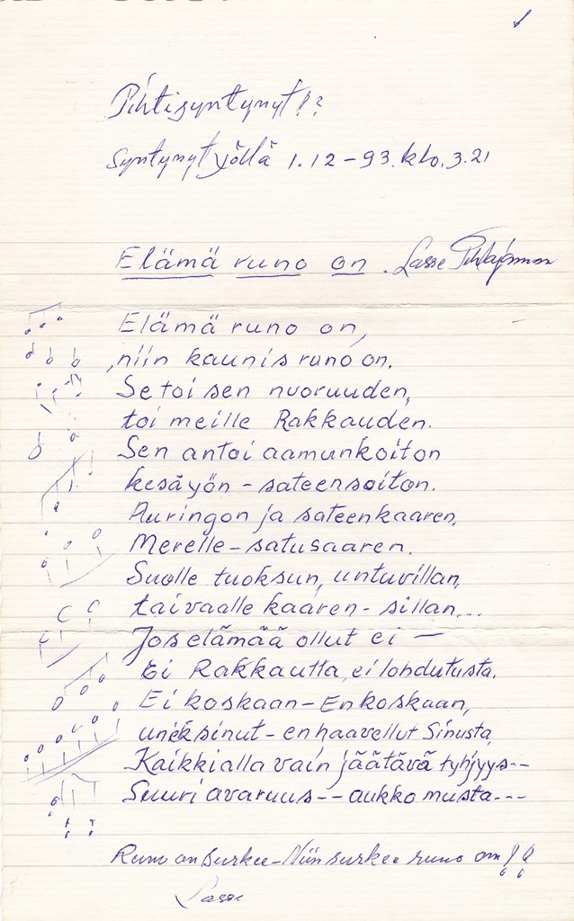 x 8,5 cm kokoinen paperilappu, jossa tervehdys: "Lasselle