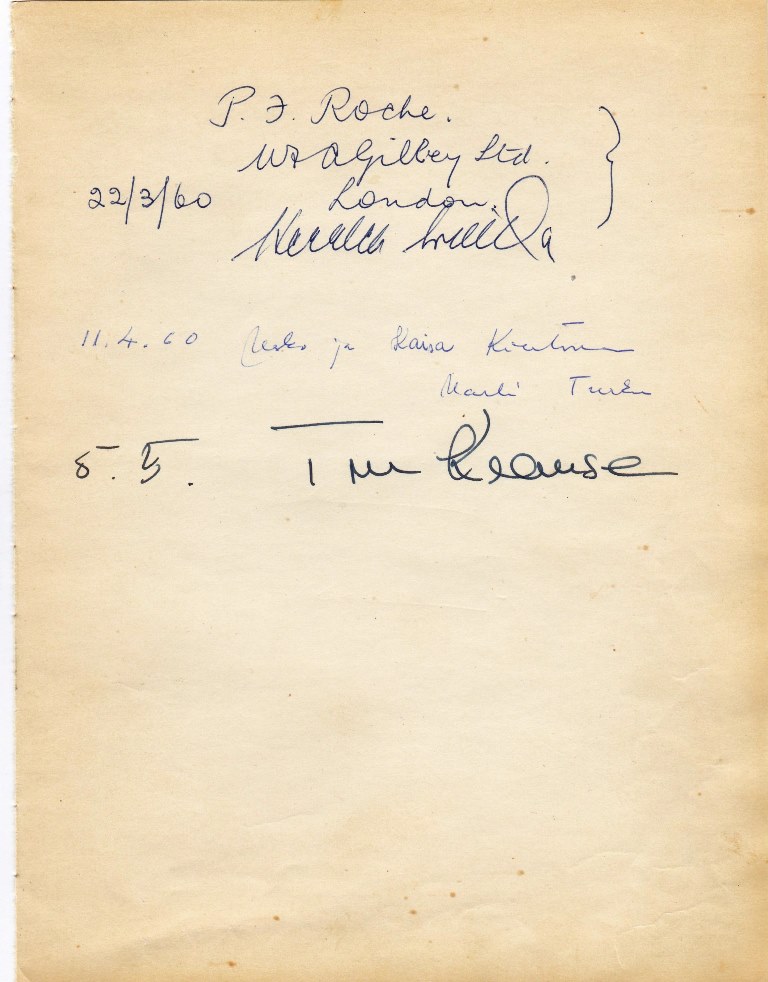 jolla Ranisen ja Aarre Elon (1934-2022) nimikirjoitukset.