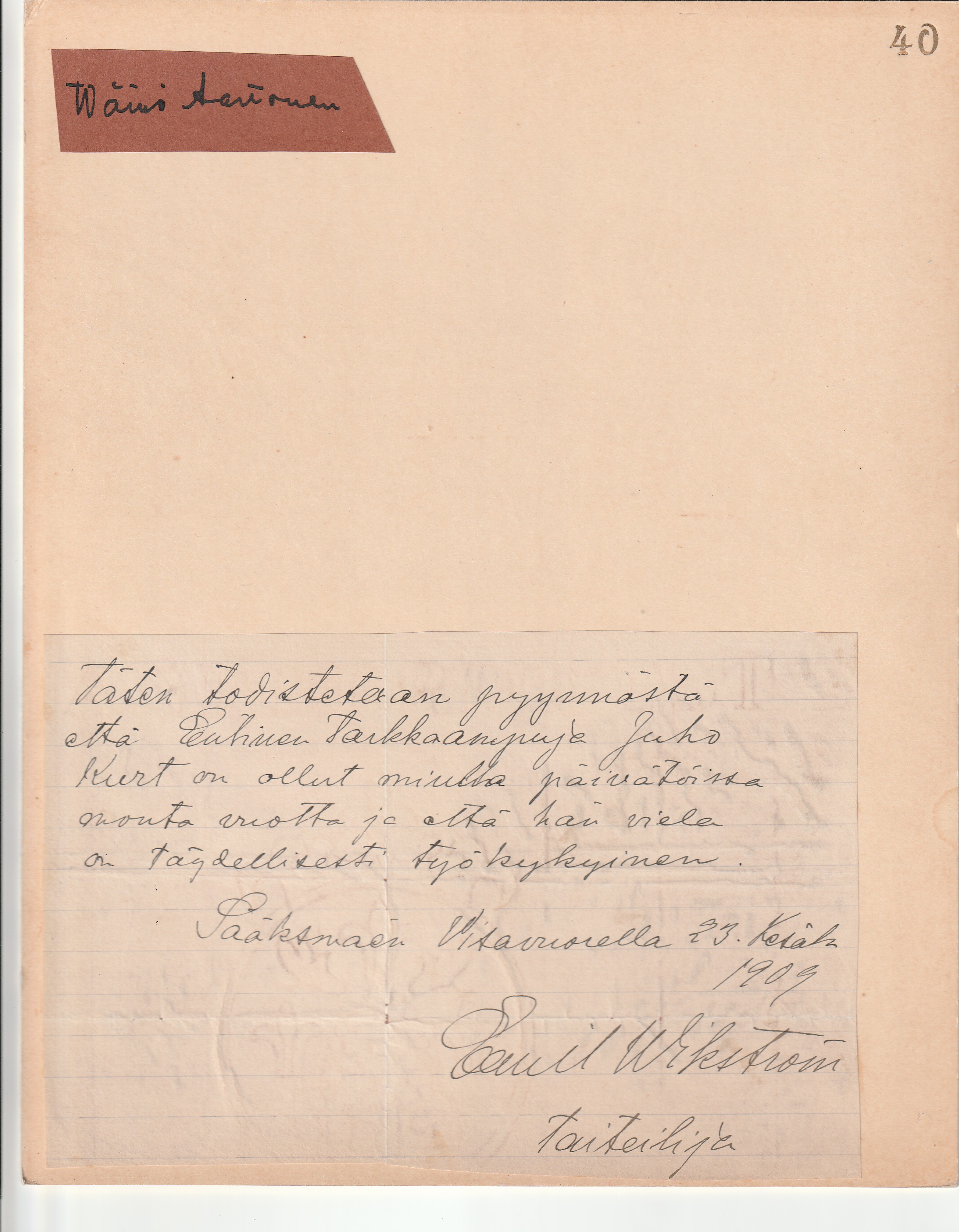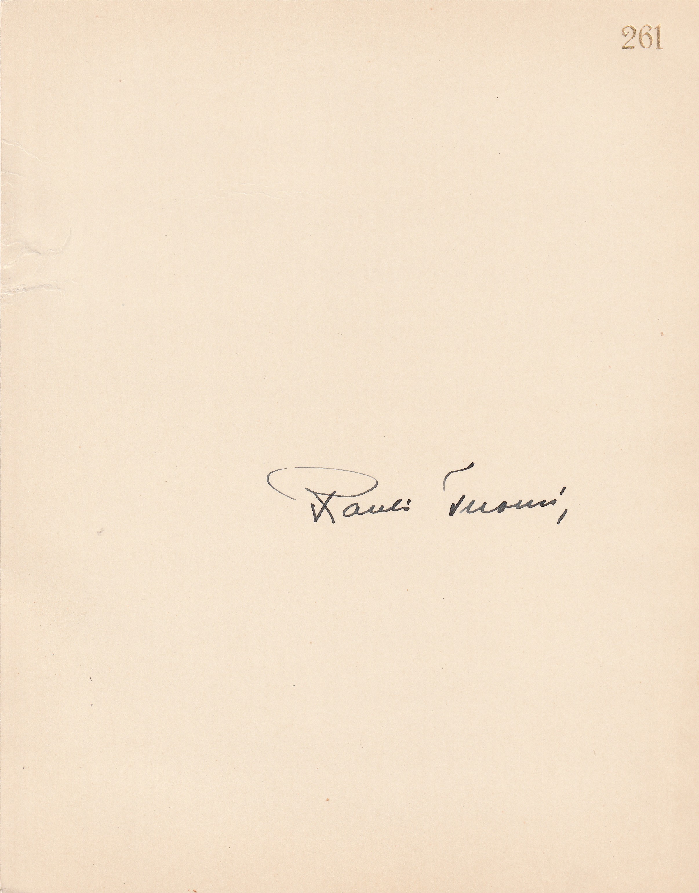 x 26,5 cm kokoinen kartonki, jolla Tuomen nimikirjoitus. ERITTÄIN
